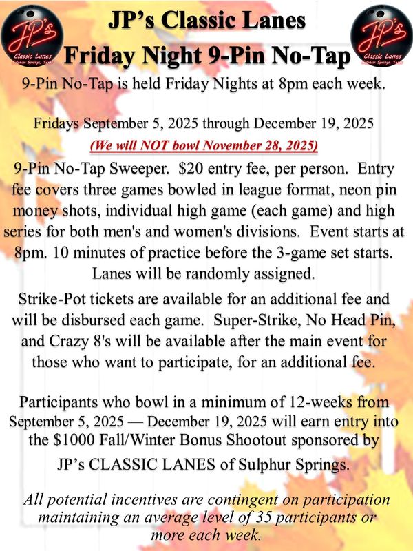 Due to Friday's 9-Pin No-Tap event, we may have limited to no open lanes after 7pm.