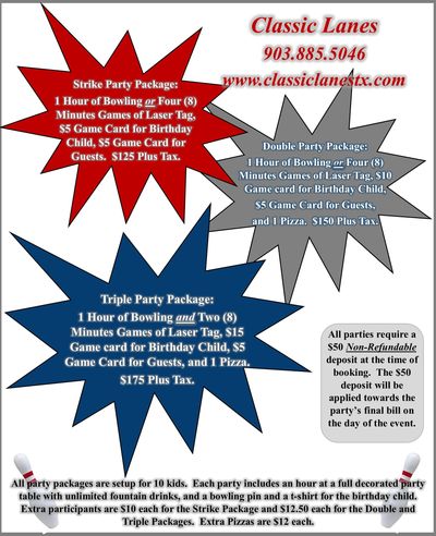 Birthday Party Packages are LIMITED to Strike and Double Bowling Party Packages ONLY! T-shirts and bowling pins have also been removed from packages.